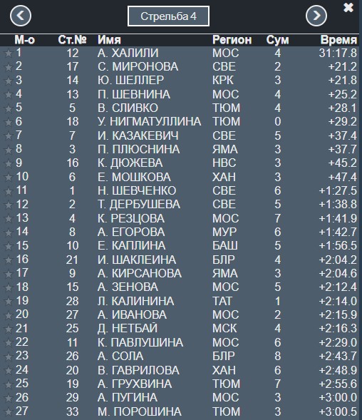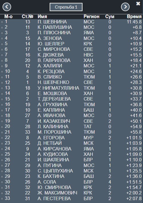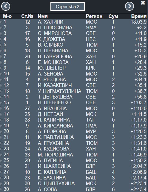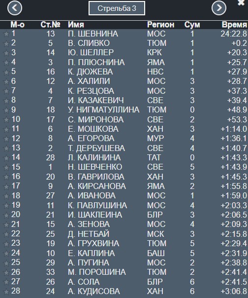 По 3 промаха у лидеров Сливко и Шевниной, падают они на 4-е и 5-е место.