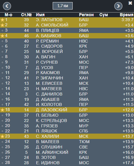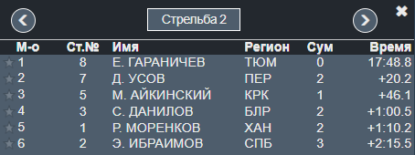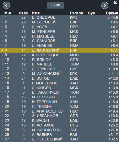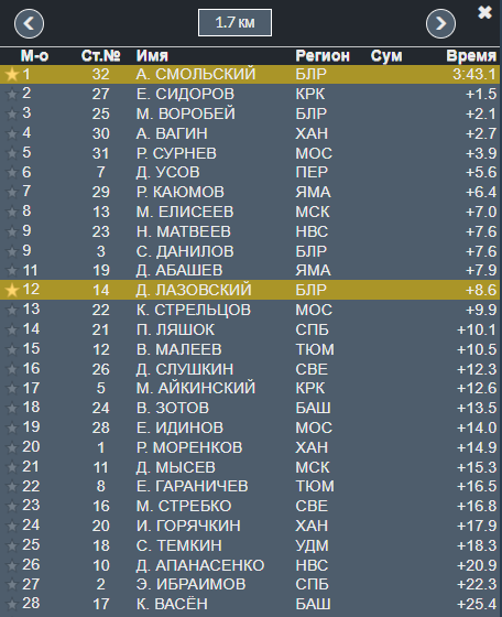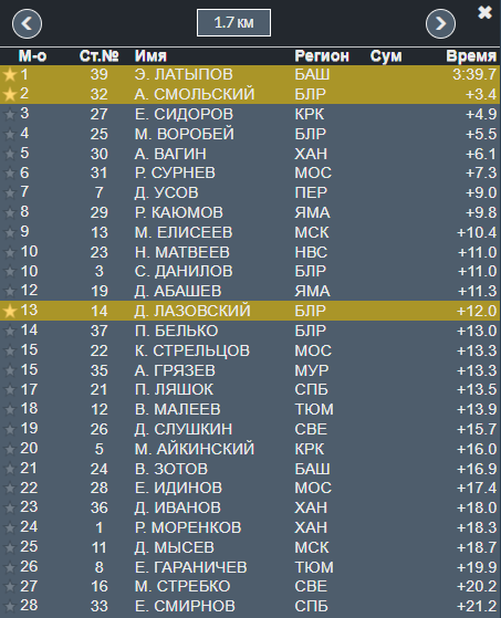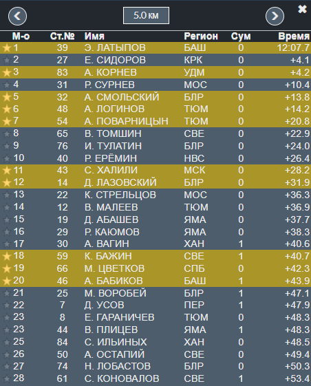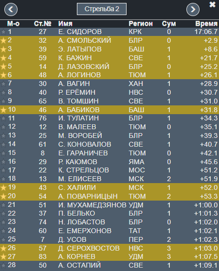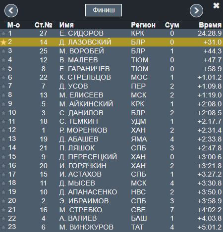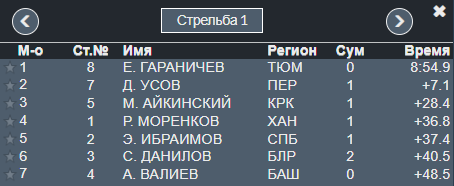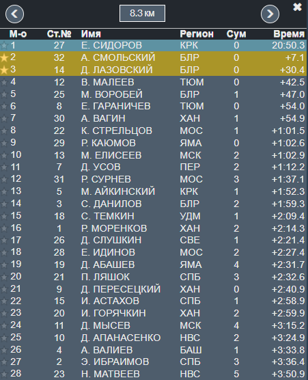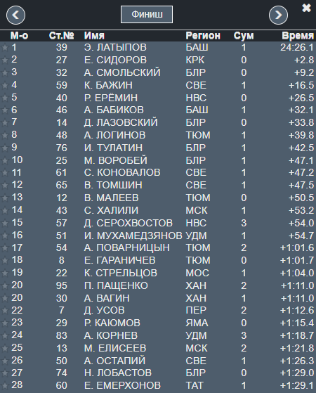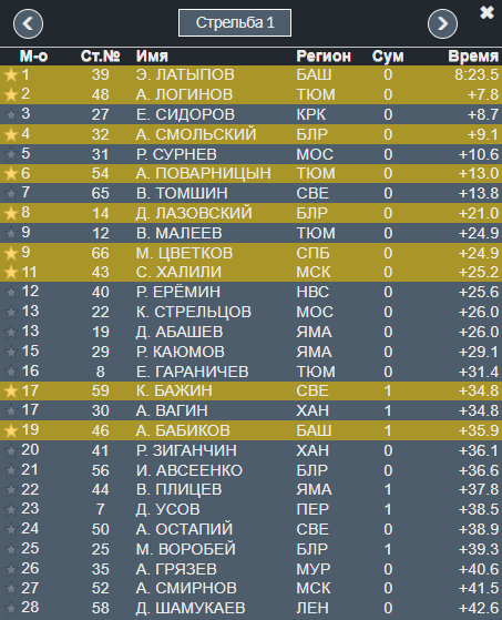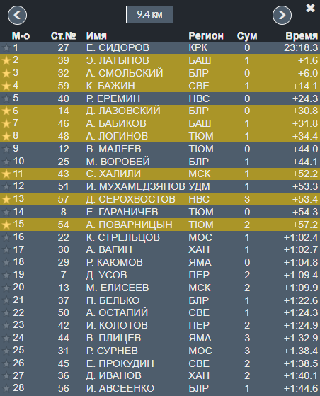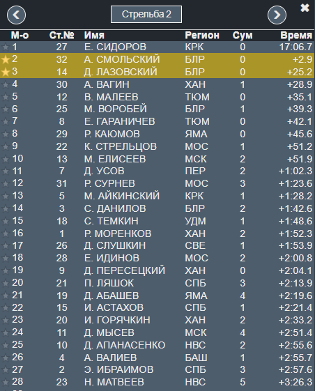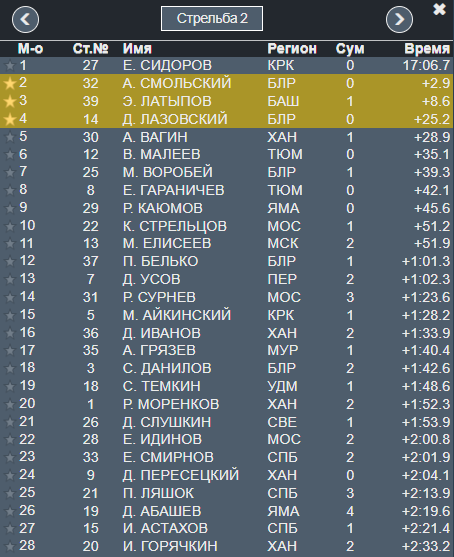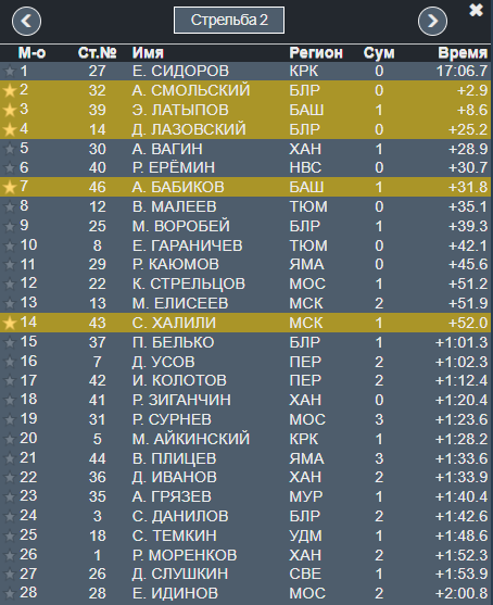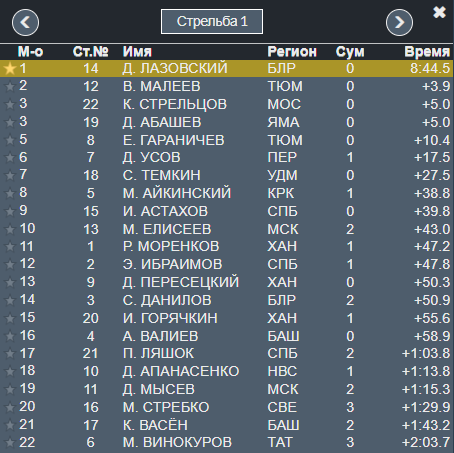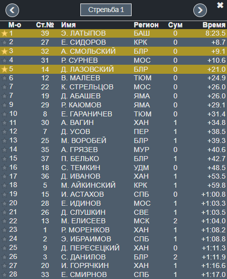 Латыпов сегодня становится победителем! С промахом Эдуард сумел обойти своих конкурентов за золото, которые на рубежах выдали ноль. Сенсацией стал Сидоров, который впервые в своей карьере отработал чисто на рубежах. В борьбе за серебро он обошёл именитого призёра Олимпийских игр Смольского. Разница между первым и третьим местом составляет всего девять секунд. Гонка преследования будет очень интересной. Стоит отметить также Бажина, который с промахом занял четвёртое место и уступил Латыпову 16,5 секунд. Вообще, целых 16 спортсменов имеют отставание до минуты. Претендентов на медали завтрашней гонки очень много. Ну а сегодняшний спринт для Вас провёл Даниил Чугунов, до новых встреч на Sport.ru!