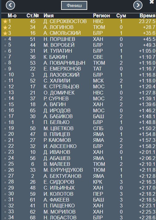 Серохвостов финишировал на 1 месте, опередив Логинова на 28 секунд.