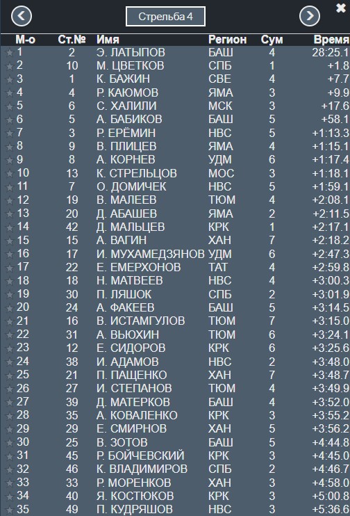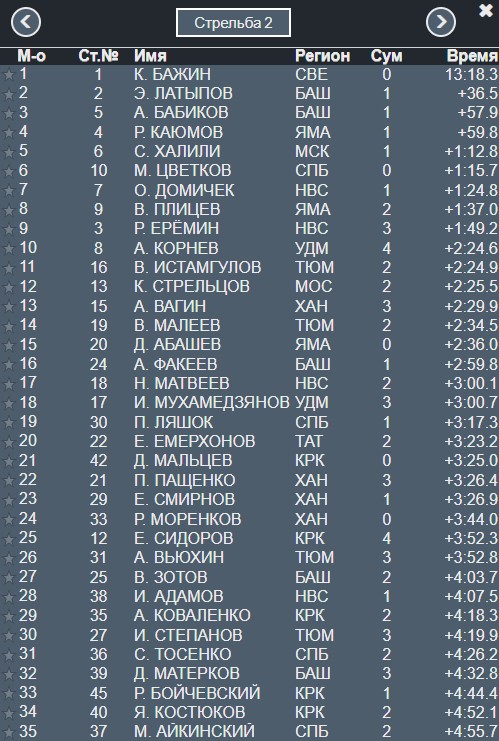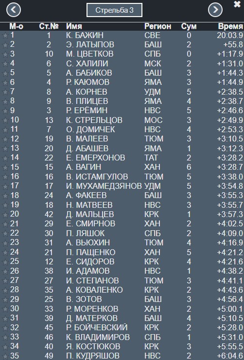 До 21 секунды сократил отставание от Бажина Латыпов, Далее в 47 секундах идут вместе Каюмов и Бабиков.