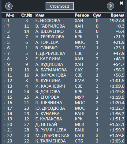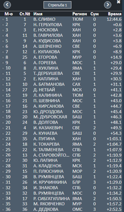 Гаврилова - лучшая после 4-й стрельбы, но Гореева всего в 0,3 секунды, а Дербушева - в 3,7 секунде! Ух, вот так борьба!