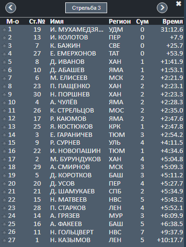 Бажин, Абашев и Коротков. Пока так выглядит у нас первая тройка! Без промахов стреляли ребята.