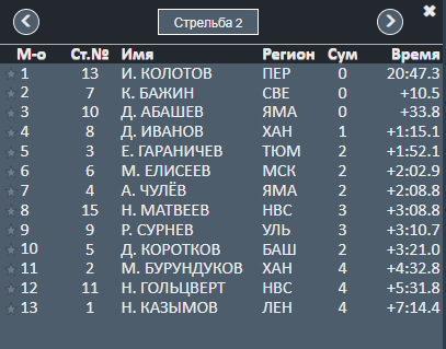 Гараничев допустил один промах, оказывается он на четвёртом месте с отставанием в 35 секунд. Многовато, конечно.
