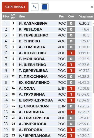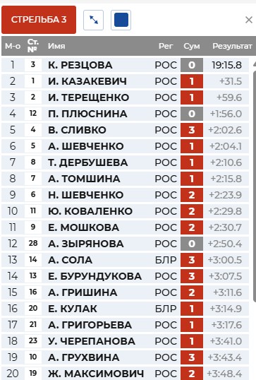Перед первой стрельбой Казакевич выигрывает 6 секунд у Резцовой, 7 - у Терещенко.