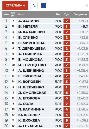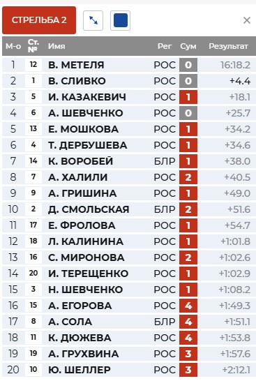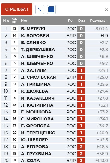 Только 6 биатлонисток отработали на 0 и лидерство захватила Метеля. Воробей, Сливко и Дербушева сразу за ней.