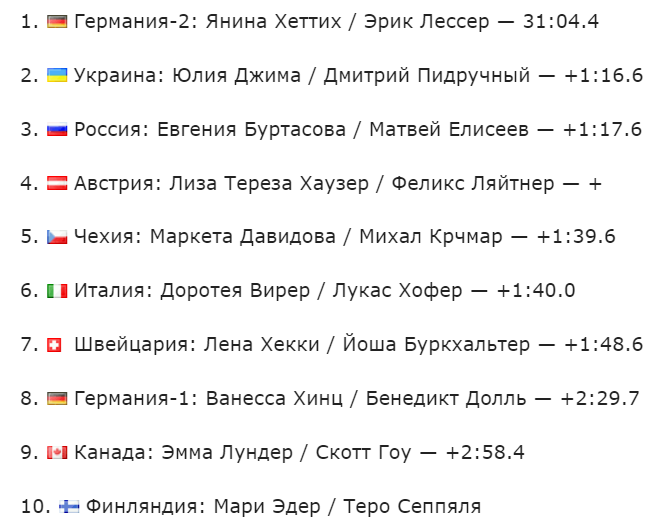 Первый круг позади. Украинцы идут первыми - Джима передала эстафету Пидручному, дальше идут немцы. Наша пара на четвёртом месте - 17 секунд отставания от лидера. Пошёл на свой круг Матвей Елисеев!