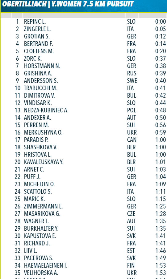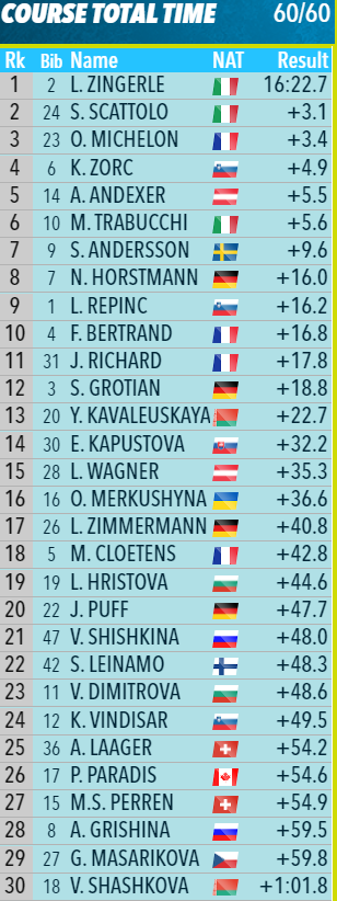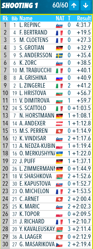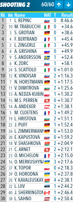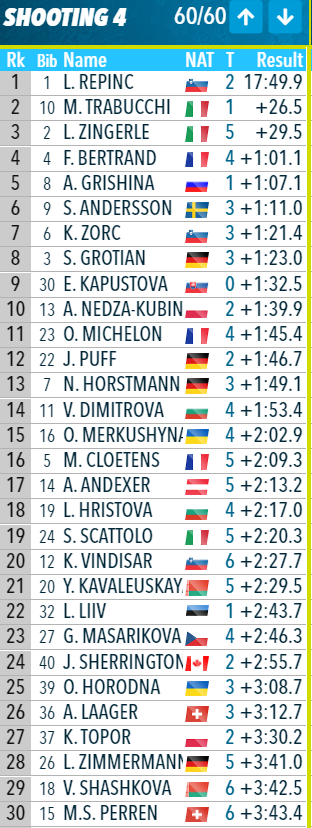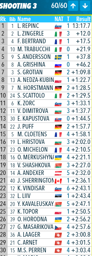 Зингерле на этот раз справляется со стрельбой и выходит второй в 12 секундах. Она самая быстрая сейчас.