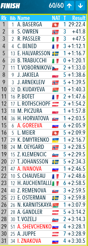 Пасслер сокращает немого отсавание от Басерги, а Гореева и вовсе уже в 29 секундах, Анастасия идёт вместе с Якелой из Польши.