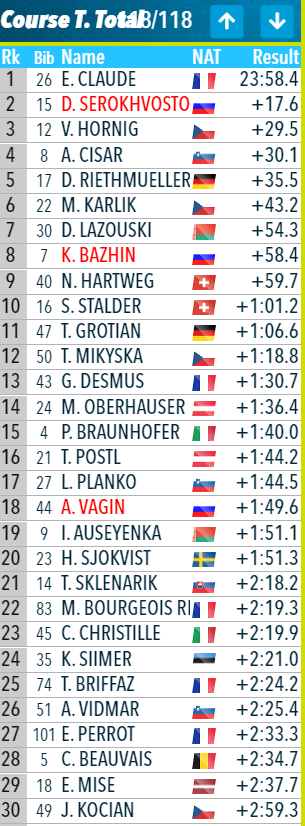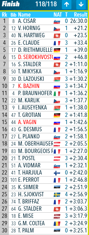 На финише пока первый словенец Цисар, второй чех Хорниг, третий немец Рейтмюллер. Серохвостов на 4 месте, Бажин - на 6-м.