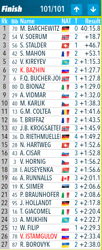 Истамгулов стартовал, но очень слабо, да ещё и минуту штрафа схватил на первом рубеже. Он в четвёртом десятке.