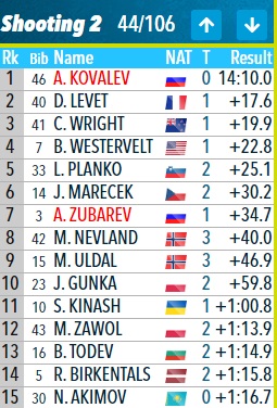 Ковалёв пока остаётся на первом месте. Чех Манек был близок к тому, чтобы побороться за победу. Он тоже не промахивался, но всё равно отстал на 9,3 секунды.