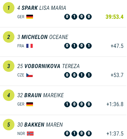 После первой стрельбы лидером гонки пока что является канадка Паскаль Парадиз. Она ровно на секунду опережает немку Лизу Марию Спарк