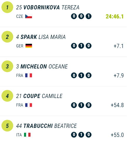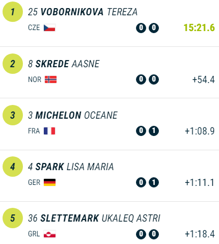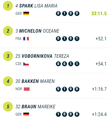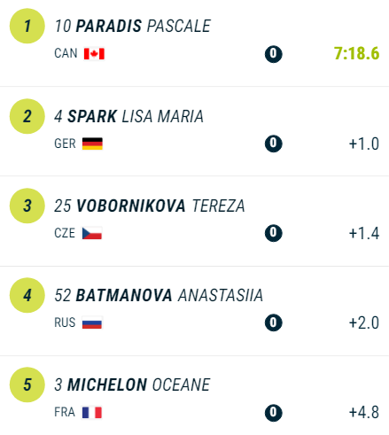 После первой стрельбы лидером гонки пока что является канадка Паскаль Парадиз. Она ровно на секунду опережает немку Лизу Марию Спарк