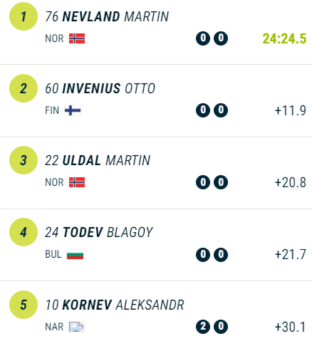 Болгарин Благой Тодев сейчас захватил лидерство после первого огневого рубежа, на 6 секунд он обогнал норвежца Оверби