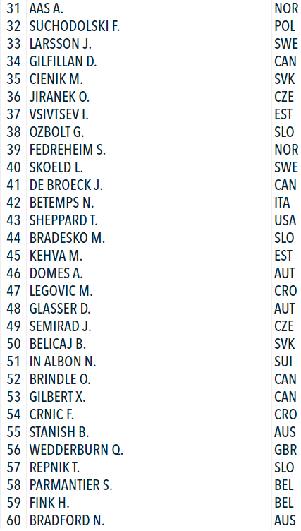 Отсечка 3.6 км. Боргула и Бадач немного оторвались от остальных. Между ними всего 0.9 секунд. Энгельманн отстаёт на 15 секунд от лидера. А далее довольно большое отставание преследователей, более 40 секунд