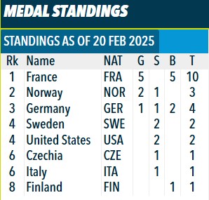 Чемпионат мира по биатлону 2025: медальный зачёт после восьми гонок