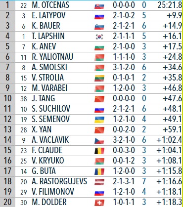 Сразу все остальные лидеры - Латыпов, Поварницын и Лапшин - промахнулись по разу и ушли на круг. В итоге при выходе со стрельбища кореец проигрывает 3,9, Бауэр имеет +4,4, у Латыпова +5,8, Поварницын чуть подотстал - 8 секунд у него отставания.