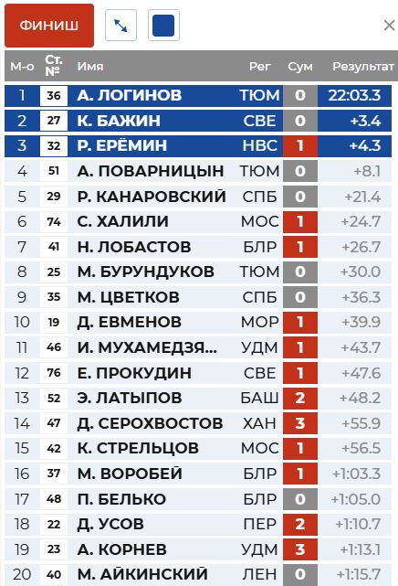 Второе место занял Кирилл Бажин, уступивший победителю 3,4 секунды и также отработавший без ошибок на стрельбе. Тройку призёров замкнул Роман Ерёмин — его отставание составило 4,3 секунды, при этом он допустил один промах.