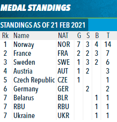На счету сборной Норвегии 7 золотых, 4 серебряных, 3 бронзовые медали в 12-ти гонках. У ближайшего преследователя Франции 2 золота, 2 серебра, 3 бронзы. У России одна бронза.