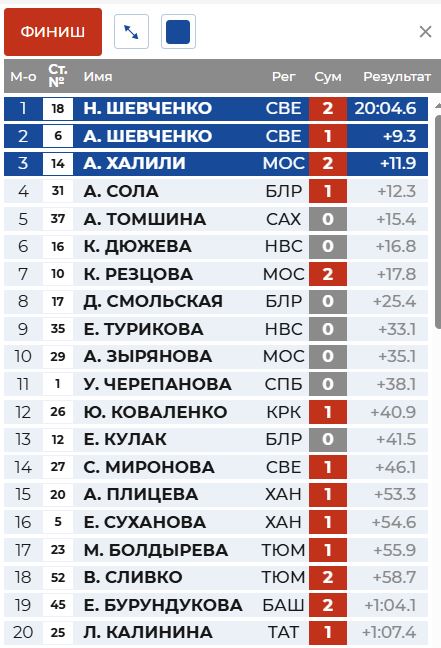 Бронзовым призёром стала Анастасия Халили, отставшая от лидера на 11,9 секунды. В её активе два промаха на стрельбе.