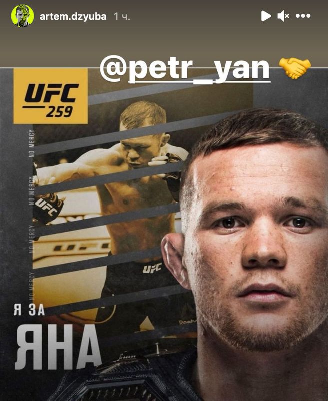 Нападающий питерского "Зенита" и национальной команды России Артём Дзюба в Instagram выразил поддержку российскому чемпиону UFC в легчайшем дивизионе Пётру Яну в преддверии боя с американцем Алджамейном Стерлингом.