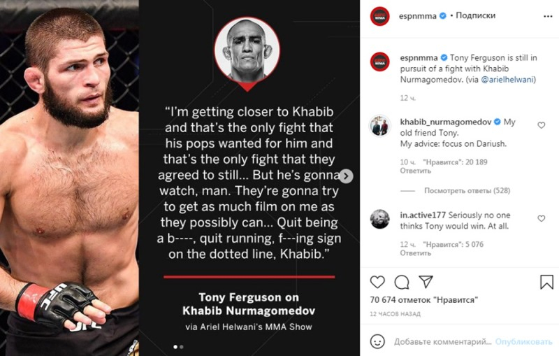 “Мой тебе совет, старый друг Тони: сосредоточься на Дариуше”, — ответил в комментариях Хабиб.
