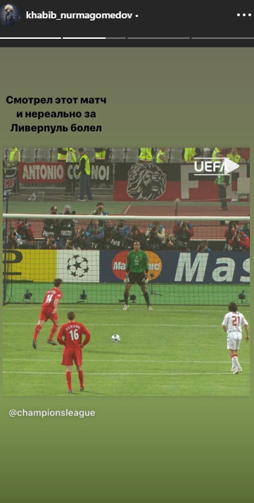 Непобедимый российский чемпион лёгкого дивизиона UFC Хабиб Нурмагомедов вспомнил финал Лиги чемпионов сезона-2004/05, в котором схлестнулись "Милан" и "Ливерпуль".