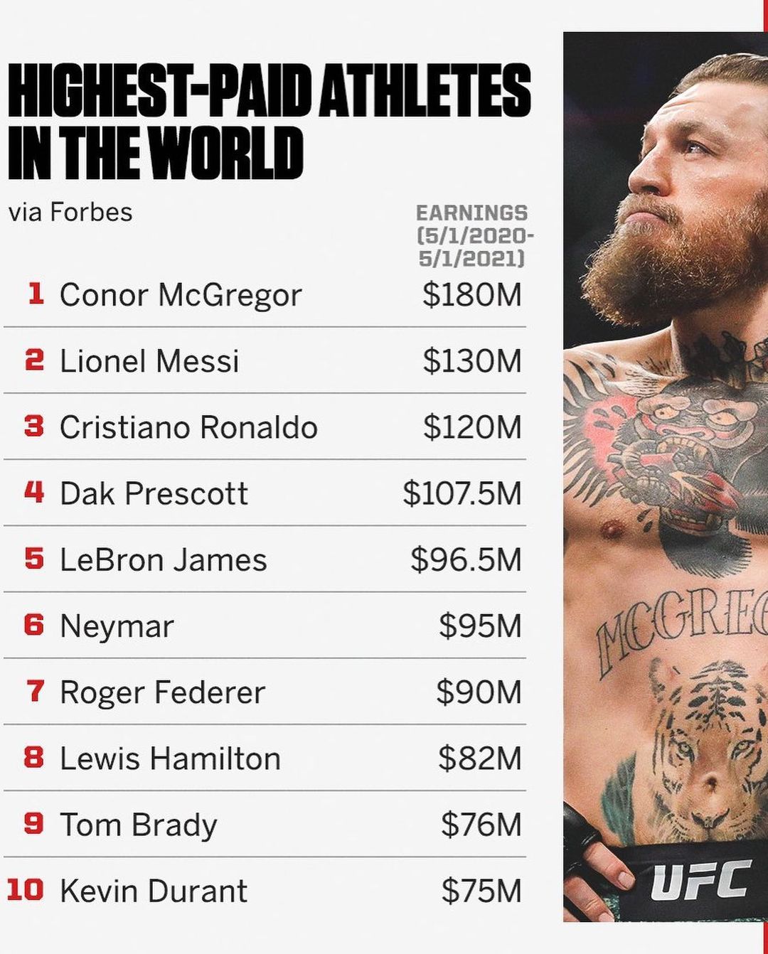 "Это безумие, как эта команда собрала всех этих невероятных игроков, ещё и в такой быстрой последовательности. Месси стоит 75 миллионов долларов, не считая бонусов. Его будет нелегко обойти в списке Forbes без ещё одного поединка. Но не нужно списывать меня со счетов. Прошло всего 2 месяца в новом финансовом году Forbes, а у меня уже есть его годовая зарплата", — отметил Макгрегор.