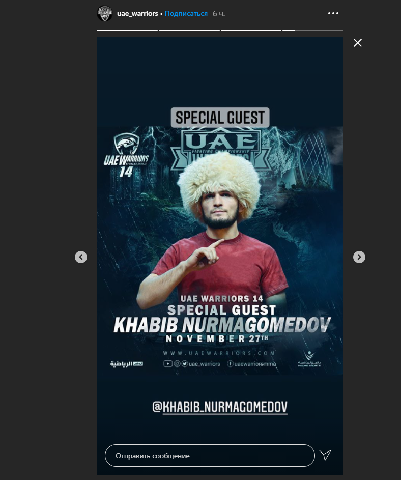 Российский боец UFC Хабиб Нурмагомедов станет специальным гостем на турнире UAE Warriors 14