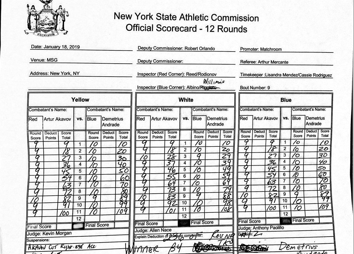 Поединок завершился в двенадцатом раунде - Андраде на протяжении всего поединка действовал более агрессивно и точно, чем соперник, но ни разу не смог отправить Акавова в нокдаун. Однако после очередного пропущенного удара рефери принял решение остановить поединок и победа техническим нокаутом досталась Андраде, что вызвало негодование со стороны промоутера Лу Дибеллы.