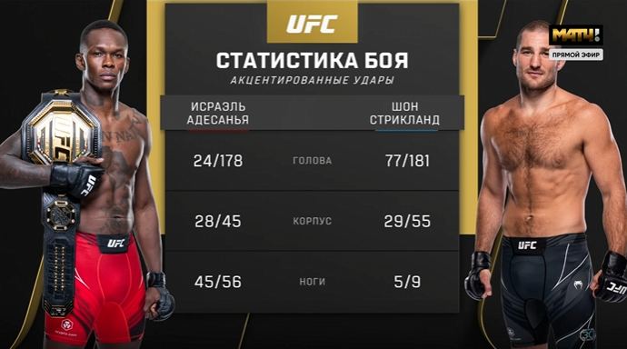 14-4 по ударам в этом раунде в пользу Стрикленда. И это серьёзно в чемпионских раундах.