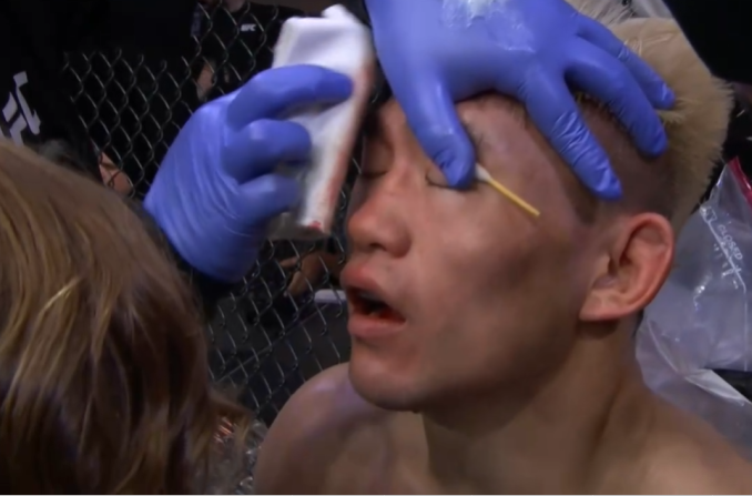 Уже два рассечения у Ядонга, но этот раунд очень близкий. 16-17 по ударам в пользу китайца.