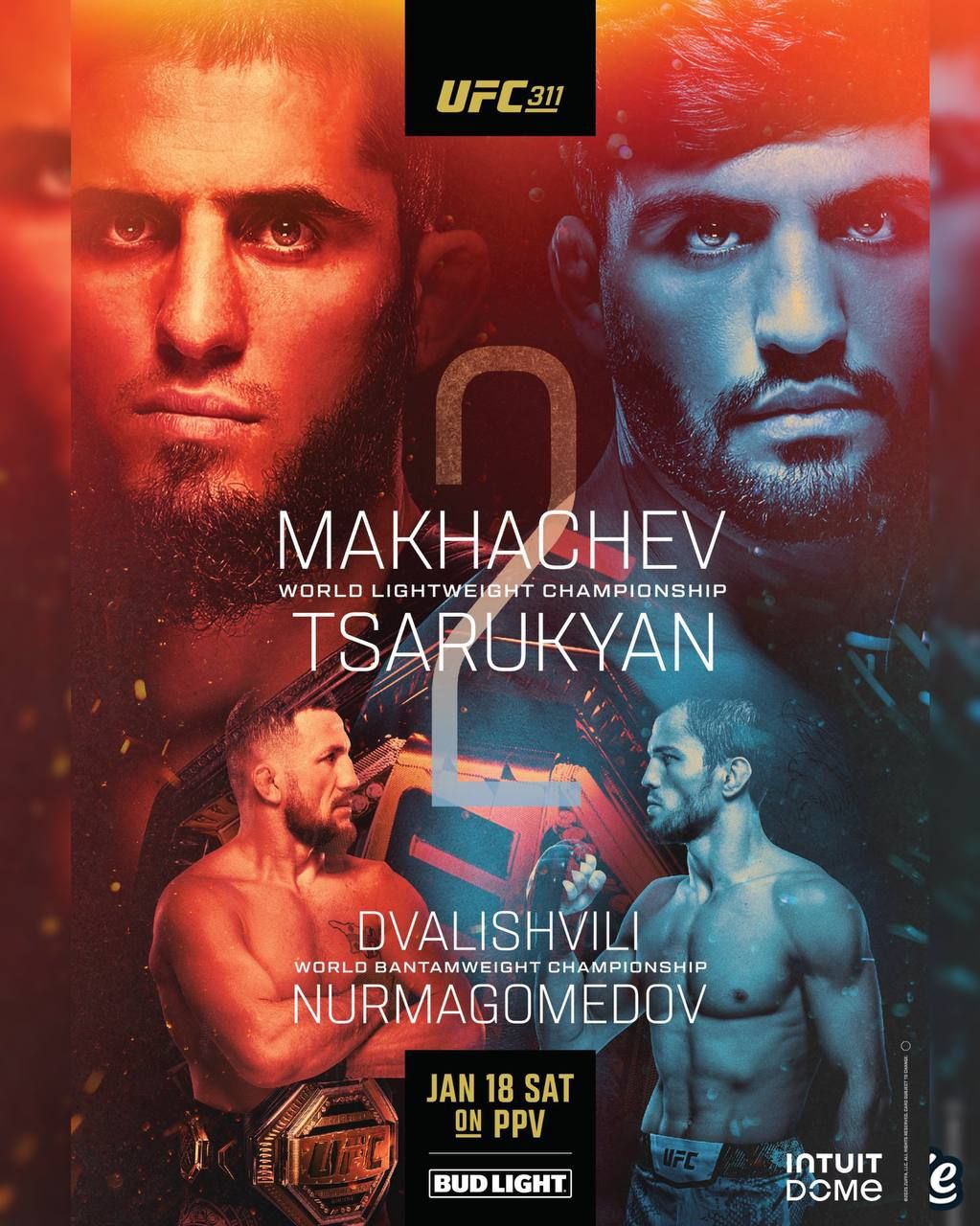 Sport.ru / MMA. Пресс-служба UFC в социальных сетях опубликовала постер к турниру UFC 311, который пройдёт 18 января в Лос-Анджелесе (США). Главным событием турнира станет титульный бой между действующим чемпионом промоушена в лёгком весе Исламом Махачевым и армянским бойцом Арманом Царукяном.