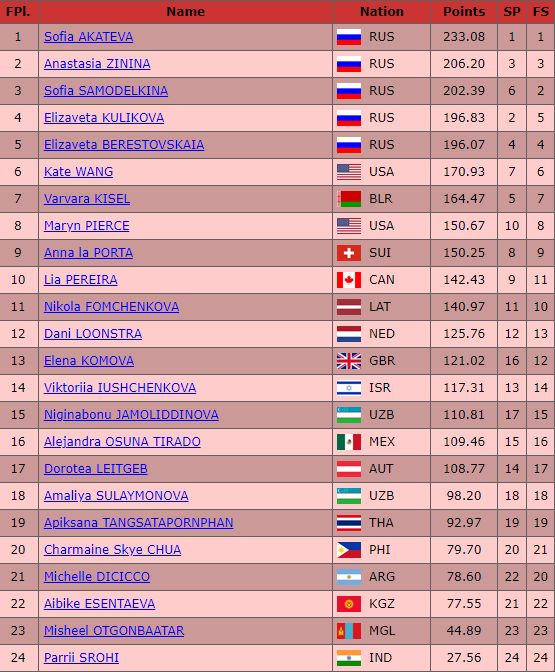Подопечная Этери Тутберидзе Софья Акатьева одержала победу на этом этапе. Она набрала 233,08 балла за две программы. На втором месте расположилась Анастасия Зинин из "Ангелов Плющенко". На её счету 206,20. Замкнула тройку Софья Самоделкина, набравшая 202,39 балла.