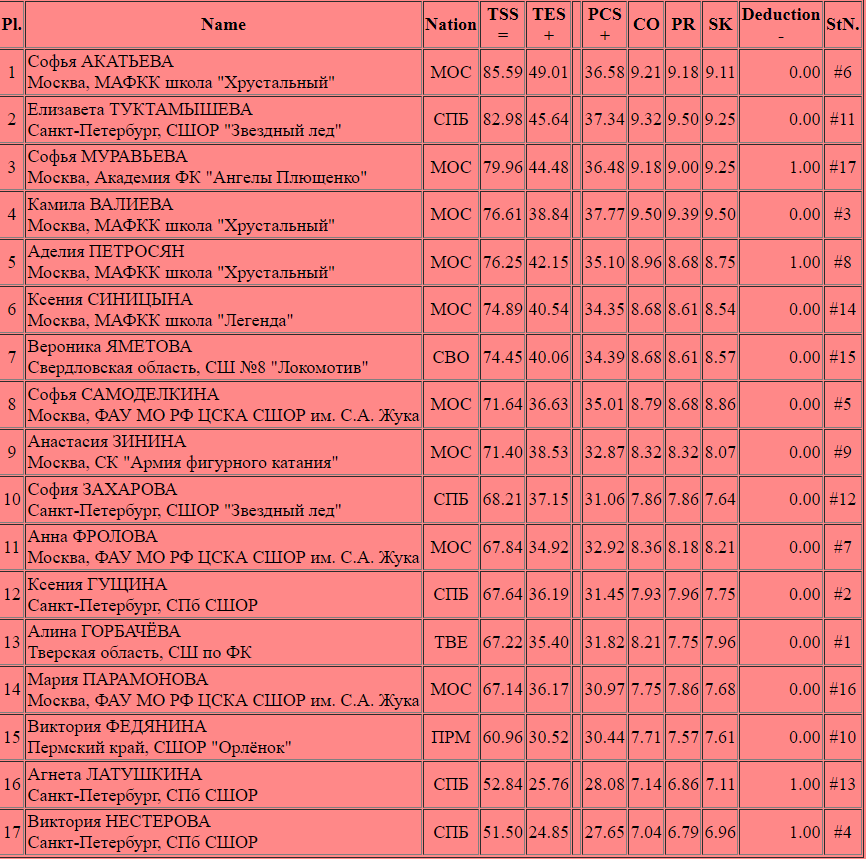 На первом месте расположилась Софья Акатьева. Она набрала 85,59 балла. Второй идёт Елизавета Туктамышева. На её счету 82,98. Замыкает тройку Софья Муравьёва. Её прокат был оценён в 79,96 балла.