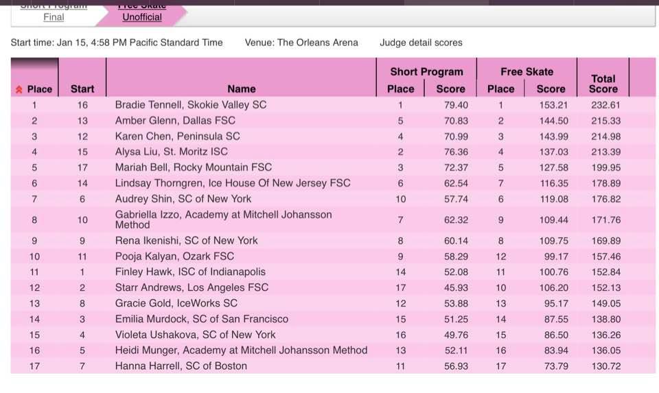 Серебро по итогам соревнований оказалось на груди у 21-летней Эмбер Гленн. Бронзу выиграла Карен Чен. Что касается самой перспективной фигуристки из США Алисы Лью, то 15-летняя спортсменка сегодня показала только четвёртый результат.