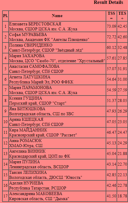 За свой прокат юная фигуристка заработала 73.09 балла. Второе место заняла ученица Евгения Плющенко Софья Мурьваёва. Её короткую программу судьи оценили в 72.72 балла.
