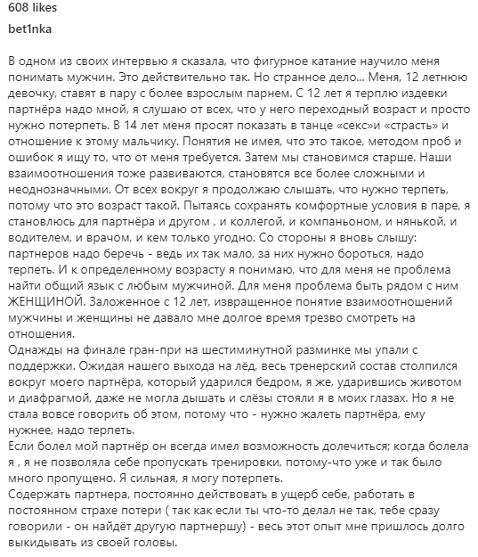 Бывшая фигуристка Бетина Попова, завершившая спортивную карьеру зимой минувшего года, опубликовал пост в инстаграме, посвящённый взаимоотношениям между партнёрами на льду