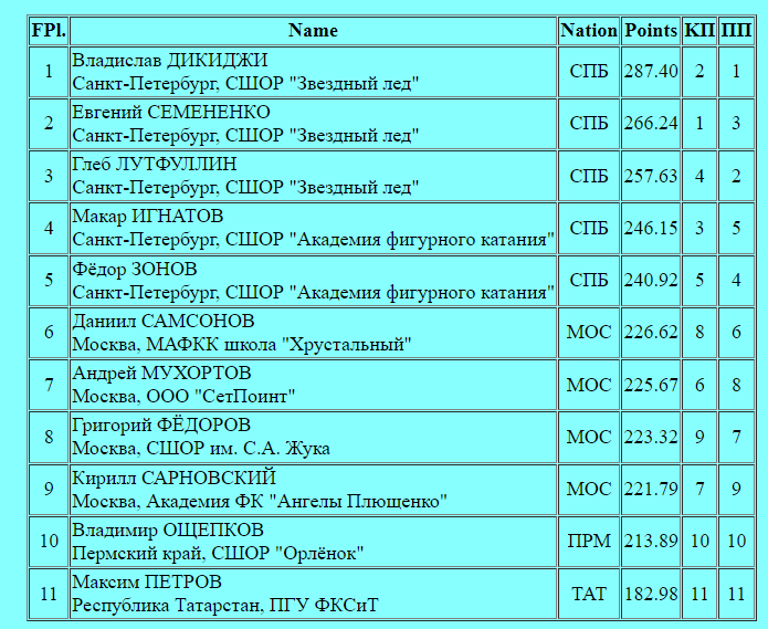 Победу одержал Владислав Дикиджи. Он набрал 287,40 балла суммарно за два проката. Он показал второй результат в короткой программе и первый результат в произвольной программе. Вторым стал Евгений Семененко. На его счету 266,24 балла. Замкнул тройку Глеб Лутфуллин. Его прокат был оценён в 257,63 балла.