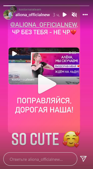 - Алёна, чемпионат России без тебя — не чемпионат России. Поправляйся, дорогая наша, - написали в фан-аккаунте Косторной. Алёна отреагировала на данный пост, написав So cute (так мило).