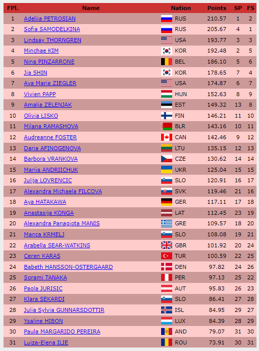 По итогам двух программ победу в Любляне одержала юная ученица "Хрустального" Аделия Петросян. За две программы фигуристка получила 210.57 балла.