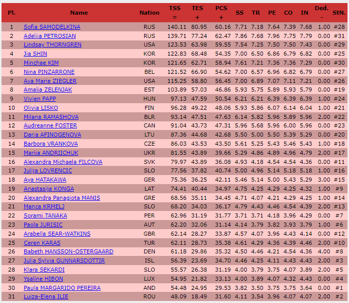 По итогам двух программ победу в Любляне одержала юная ученица "Хрустального" Аделия Петросян. За две программы фигуристка получила 210.57 балла.