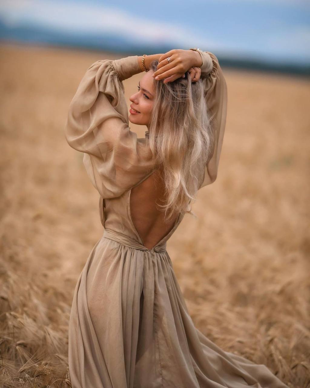 24-летняя спортсменка позирует в прозрачном платье, находясь в пшеничном поле.