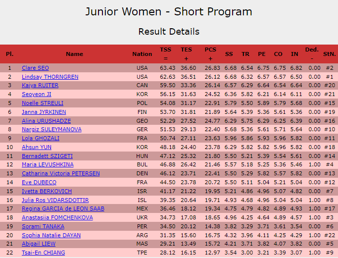 Лидерство после первого соревновательного дня захватили фигуристки из США Клер Сео и Линдсей Торнгрен, заработавшие по 63.43 балла и 62.63 балла соответственно. Тройку лидеров замкнула представительница Канады Кайя Руйтер, чей прокат судьи оценили в 59.50 балла.