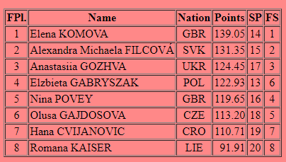 Представительница Великобритании Елена Комова получает за произвольную программу 93.38 балла и выходит на первое место в итоговом протоколе с результатом 139.05 балла.