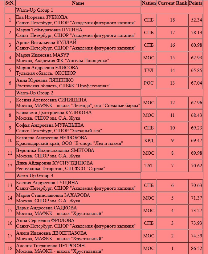 Тройной аксель с ошибкой и следом падение с четверного тулупа на старте! Затем второй заход и снова срыв четверного тулупа - только 2 оборота. Первый чистый прыжок - тройной риттбергер. Сделала следом Аделия вращение в либеле 4 уровня, 3 лутц + 2 аксель + 2 аксель, 3 флип + 3 тулуп, вращение в заклоне 4 уровня, дорожку шагов 4 уровня и комбинированное вращение 4-го.