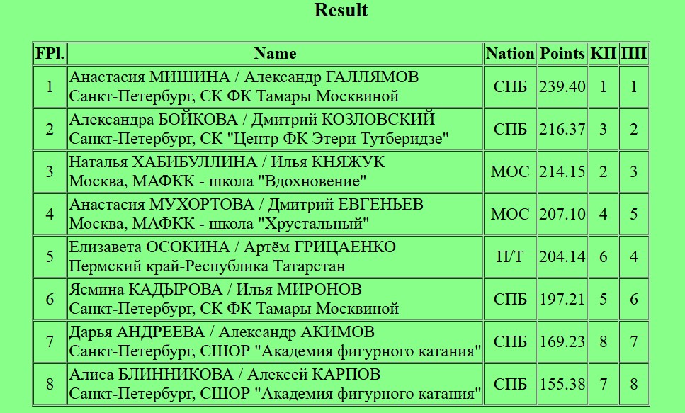 156.45 - оценка, 239.40 - общая. Мишина и Галлямов выигрывают чемпионат России.