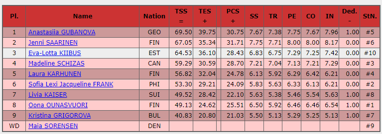 Чемпионка Эстонии 2020 года Эва-Лотта Кийбус здорово зажгла публику своей короткой программой. 64.53 балла получает 18-летняя участница чемпионата мира 2019 года. Третье место на текущий момент.