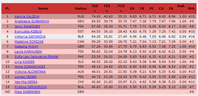 Итоговый протокол соревнований после короткой программы: