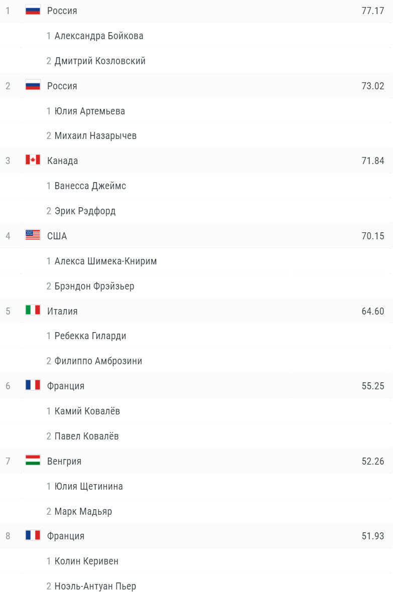 Бойкова и Козловский выигрывают короткую программу в парах, Артемьева и Назарычев - на втором месте